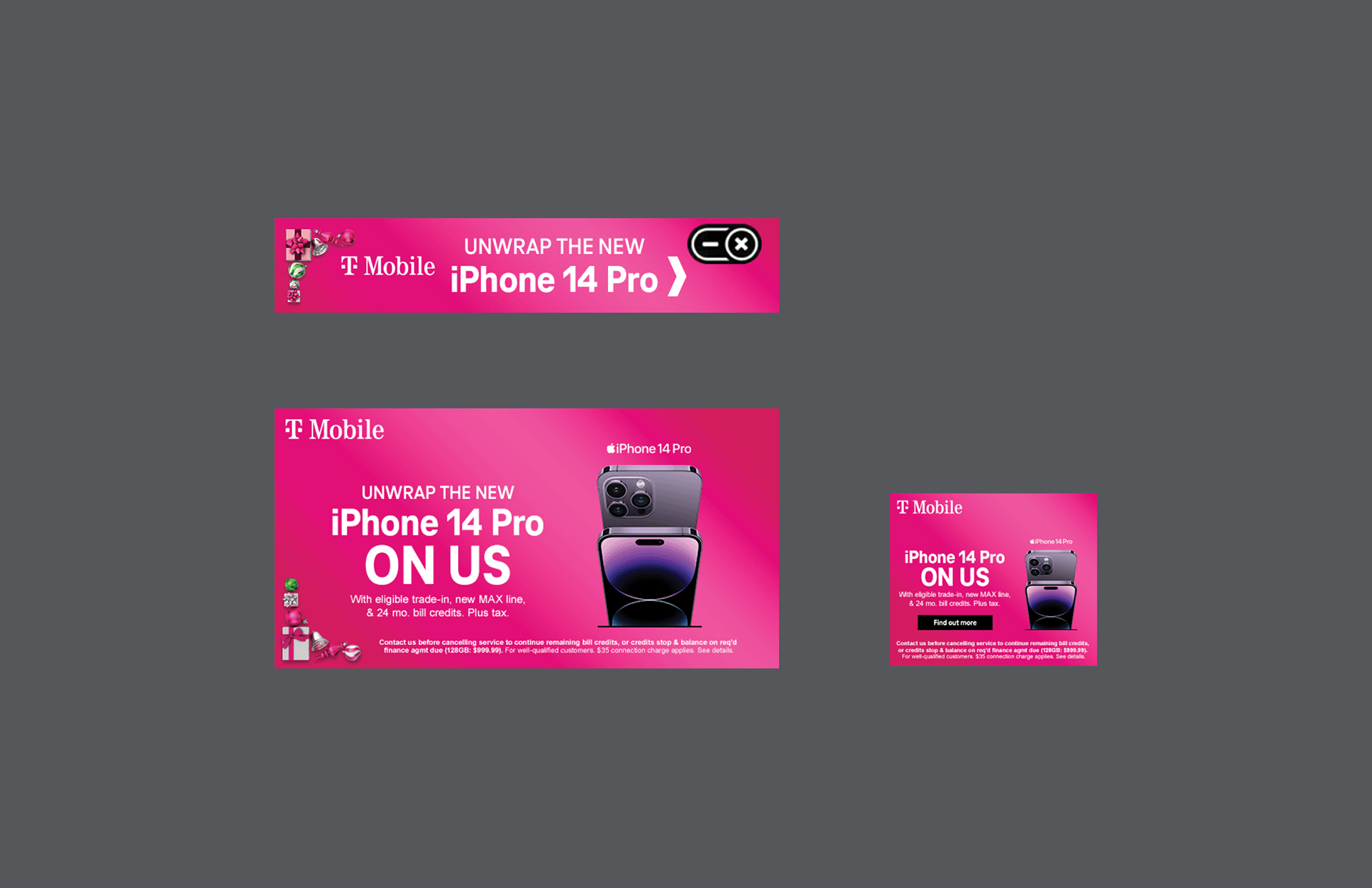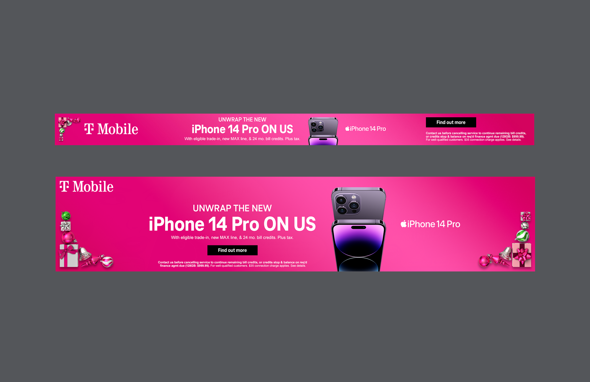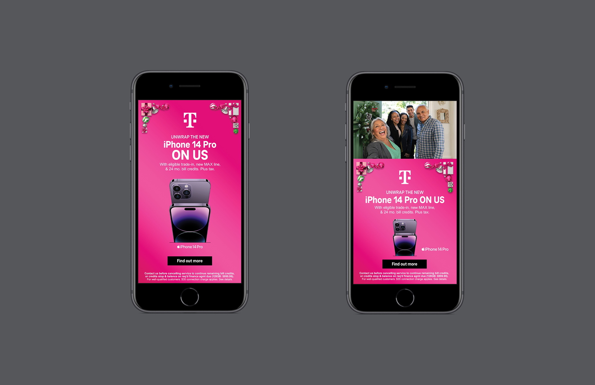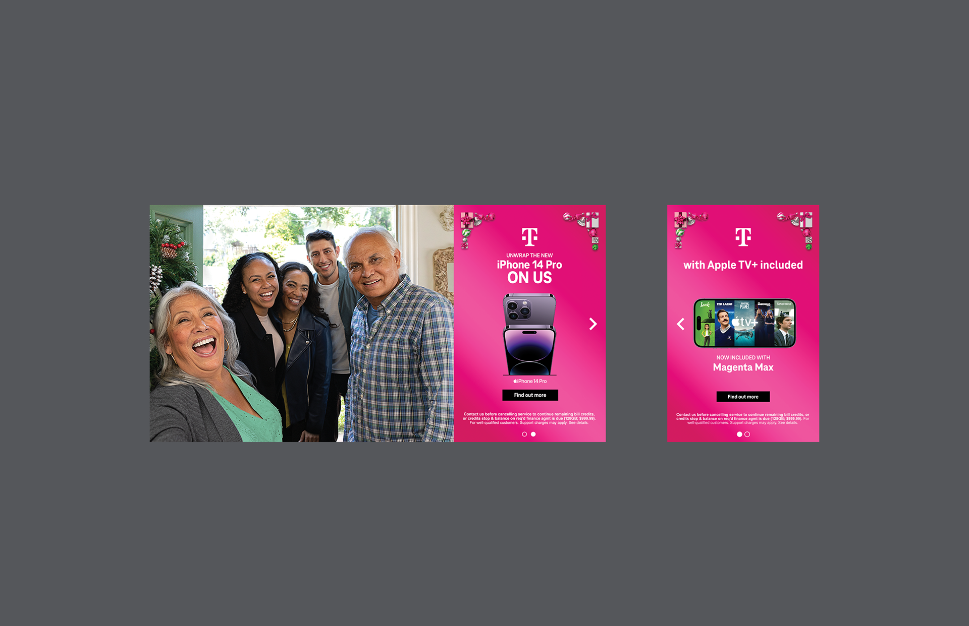 Designed digital creative for T-Mobile’s 2022 holiday promotion featuring the iPhone 14 Pro and Samsung Galaxy S22. Work included adapting the existing campaign into digital formats across web display, mobile units, social variations, and supporting layouts, following the established holiday direction and magenta palette.