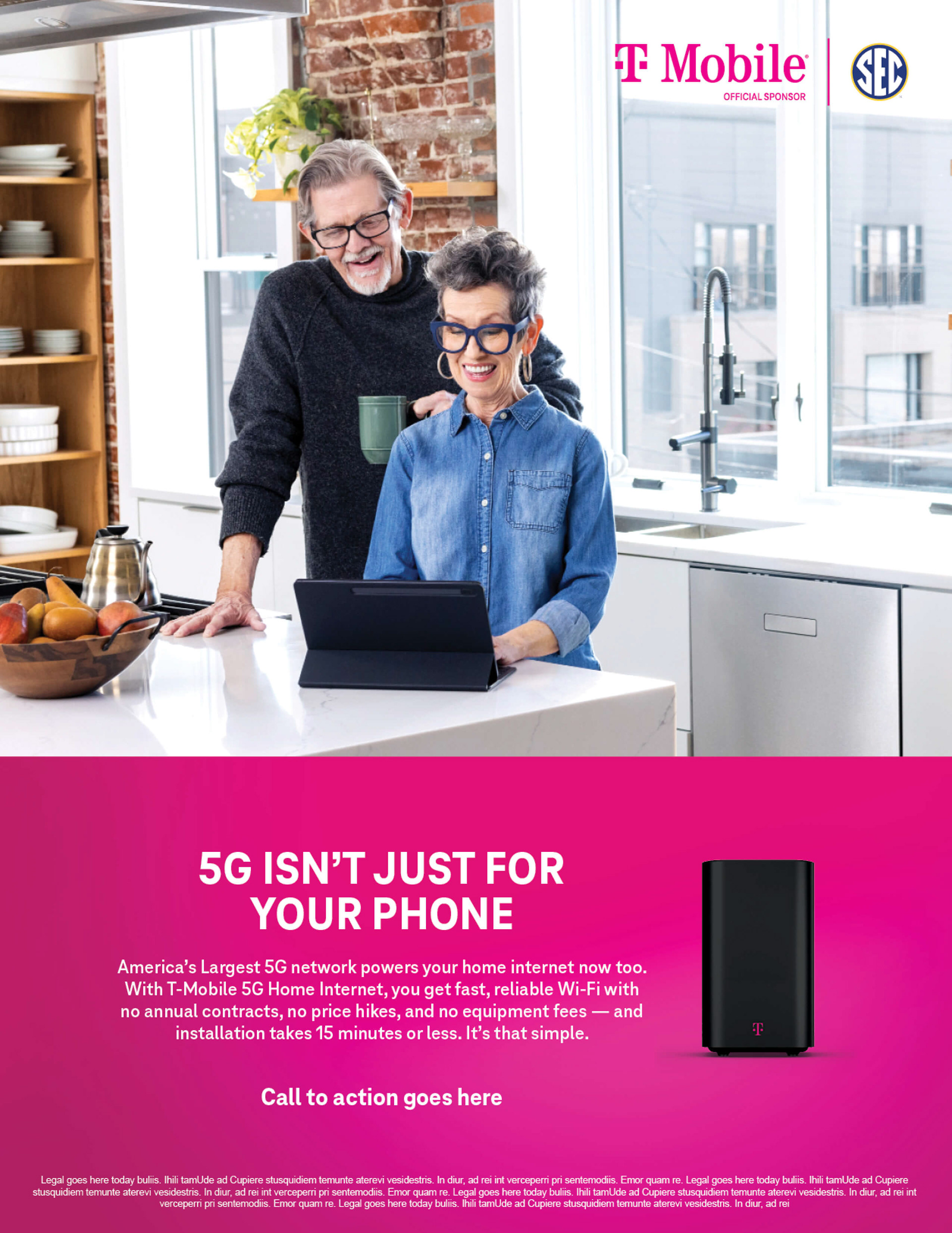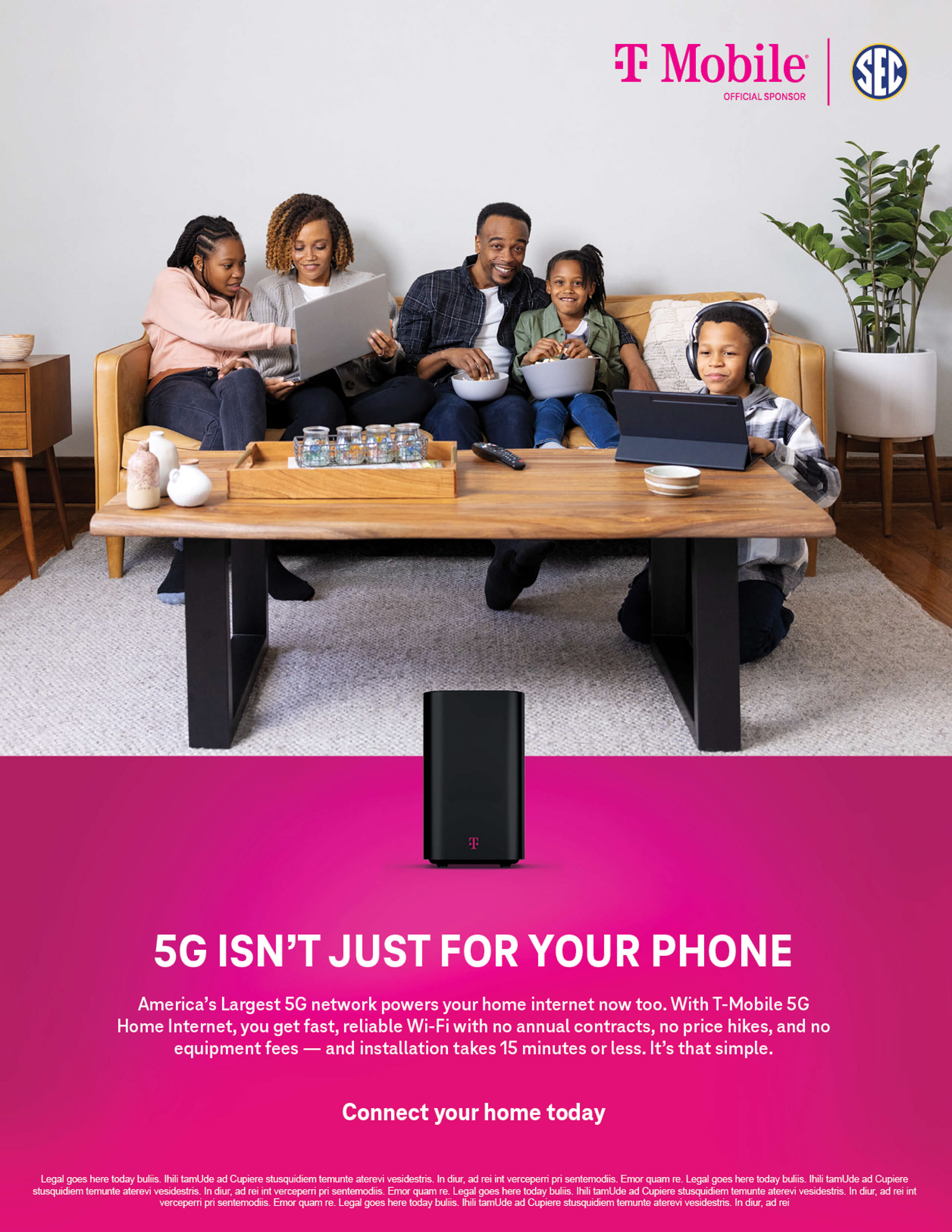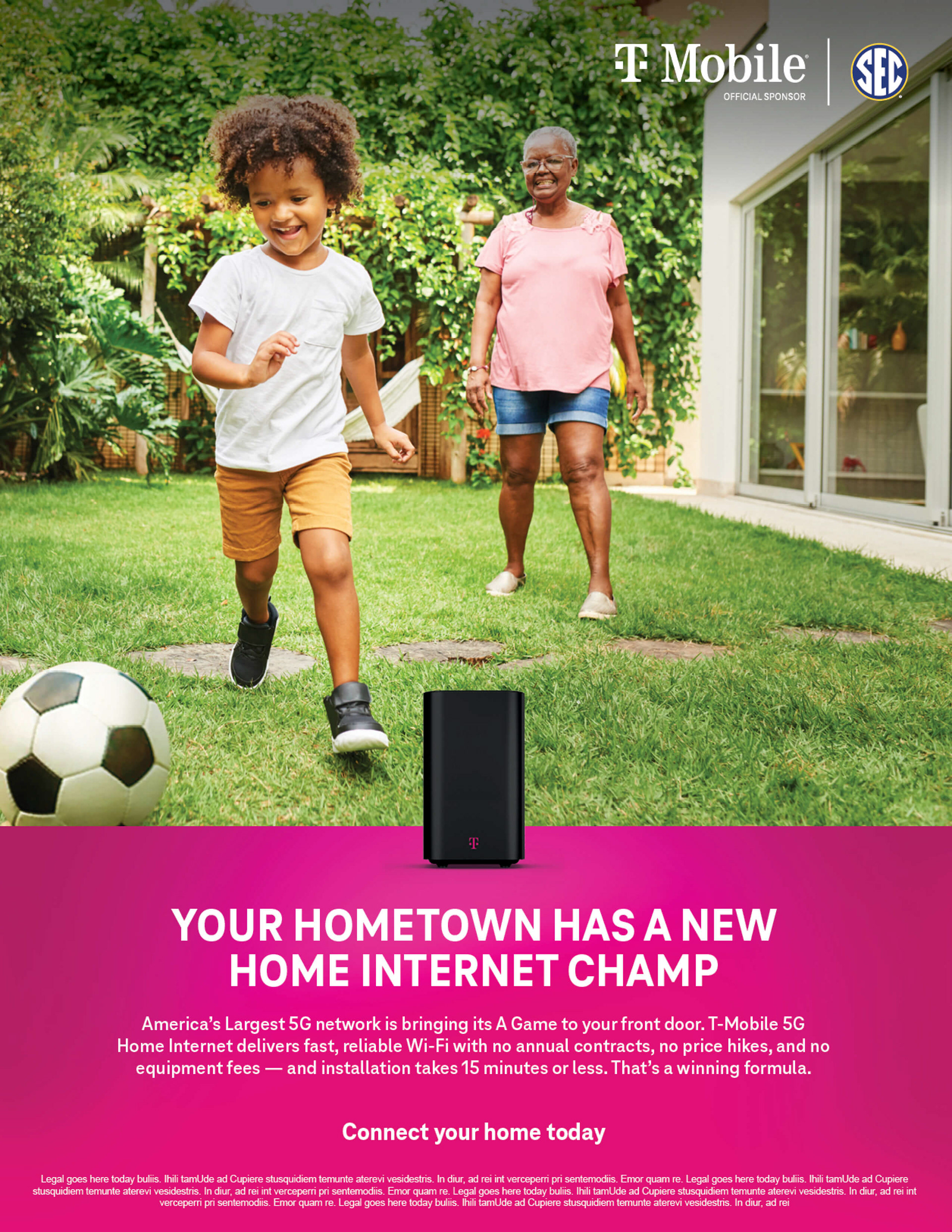 Developed campaign assets for T-Mobile’s sponsorship of the SEC, connecting the energy of college sports with the power of 5G Home Internet. The visuals emphasized enthusiasm, reliability, and brand consistency within T-Mobile’s bold magenta system. The campaign extended across digital, social, and print formats to reinforce connection and speed.