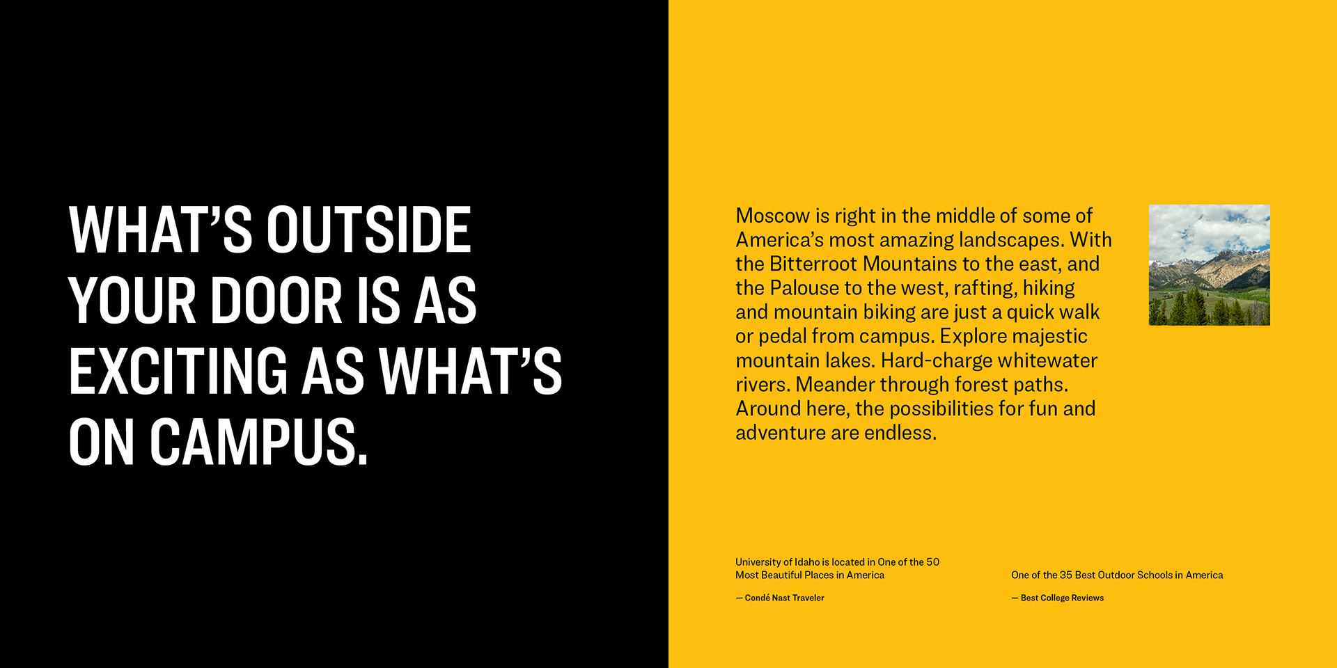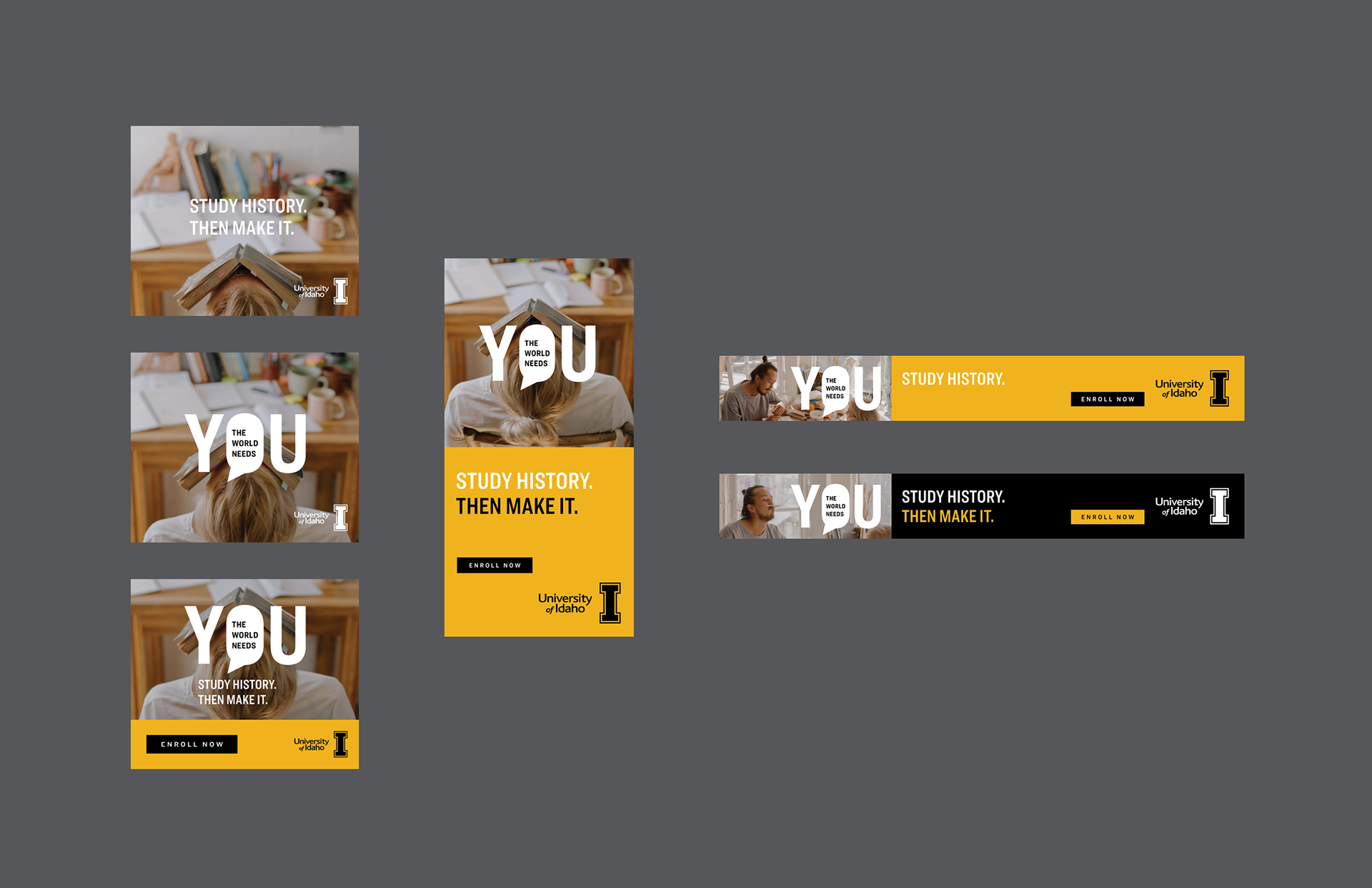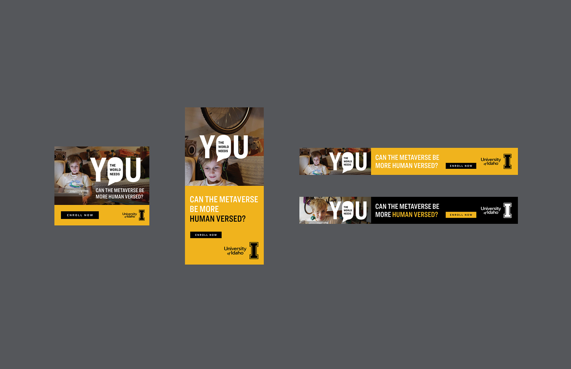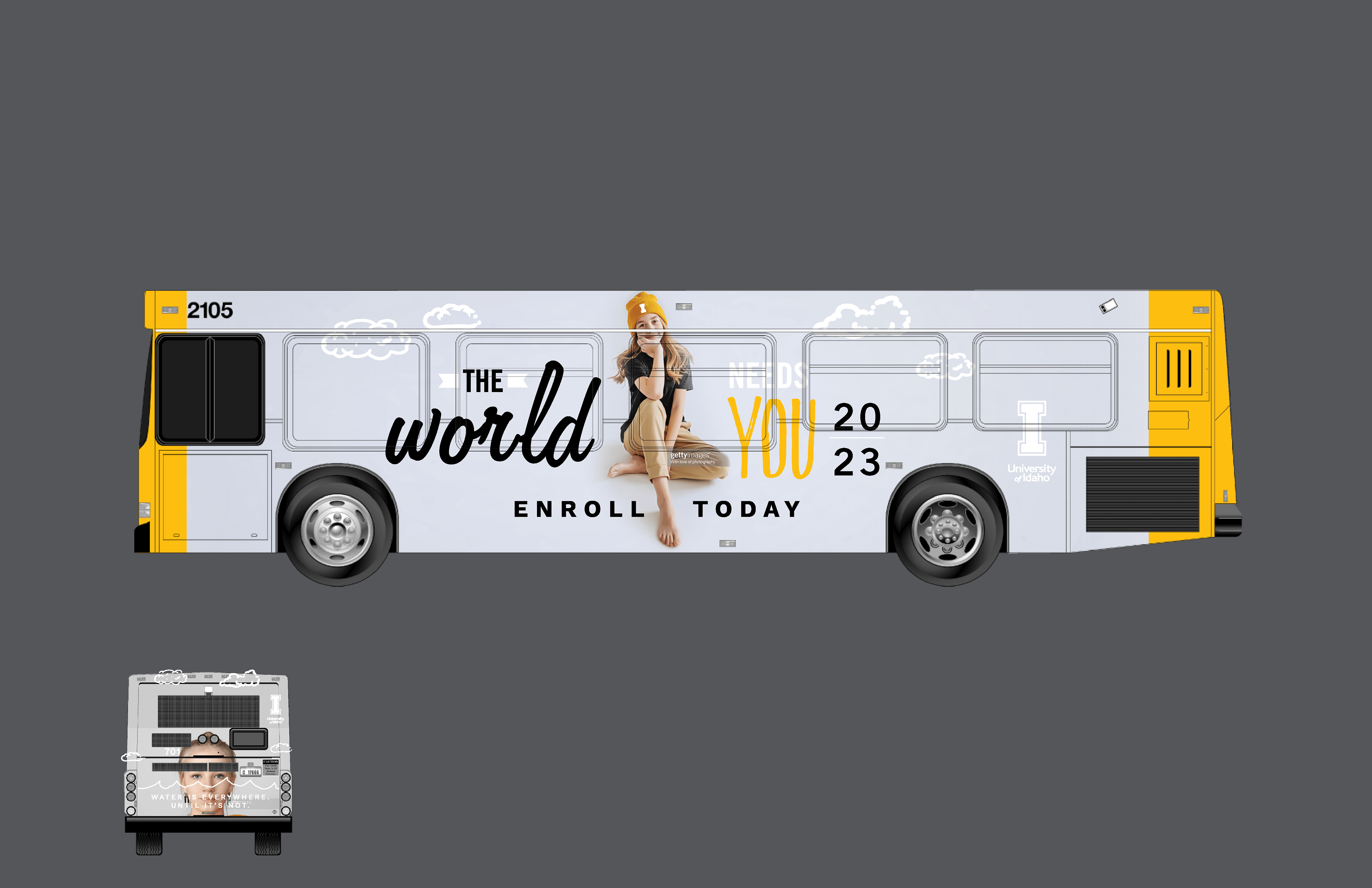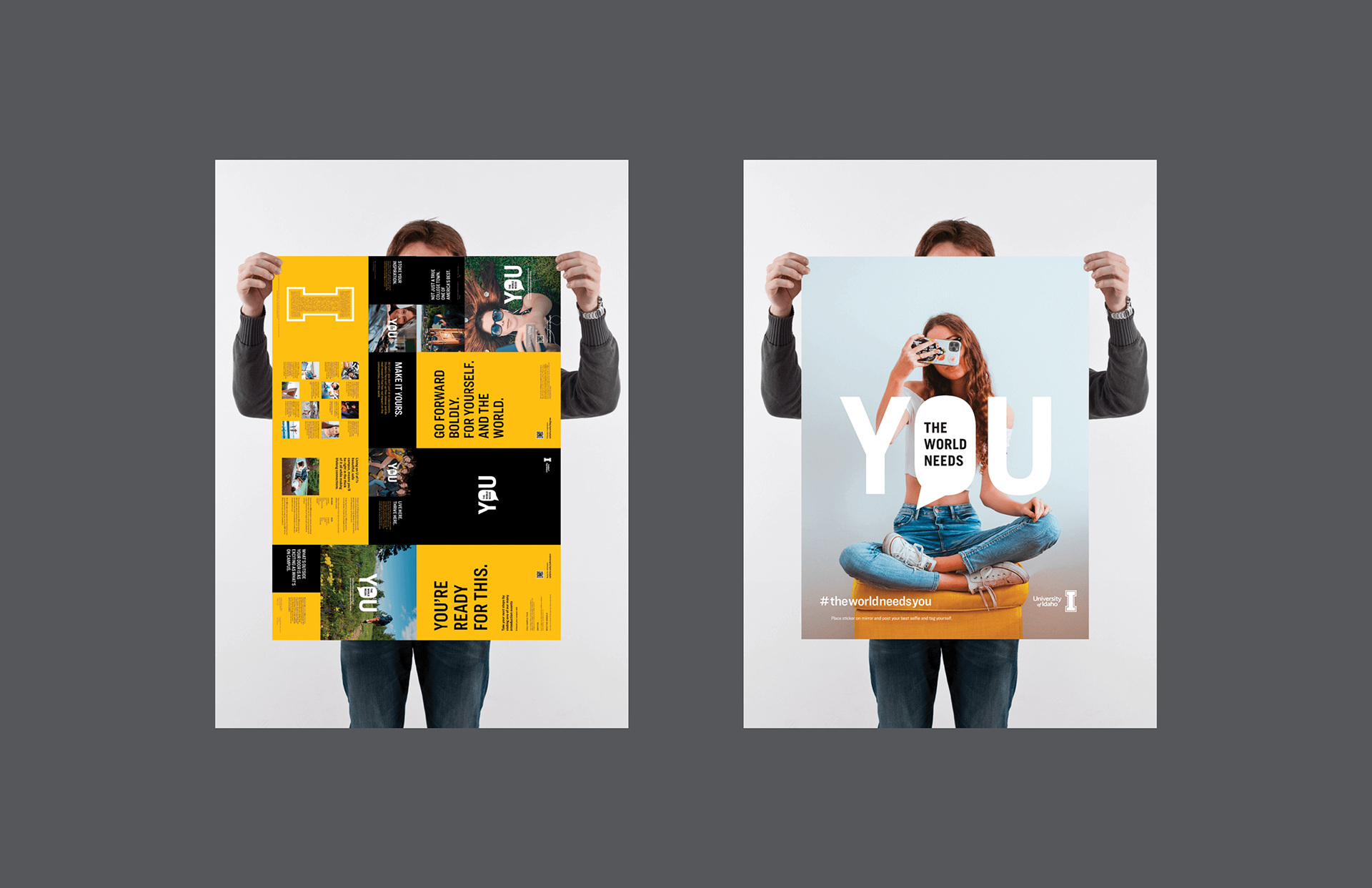 Developed an integrated campaign for the University of Idaho, built on the message “The world needs you.” The concept positioned students as essential contributors to the future. Across print, outdoor, and digital applications, the design language emphasized individuality, optimism, and empowerment through bold typography and expressive imagery.