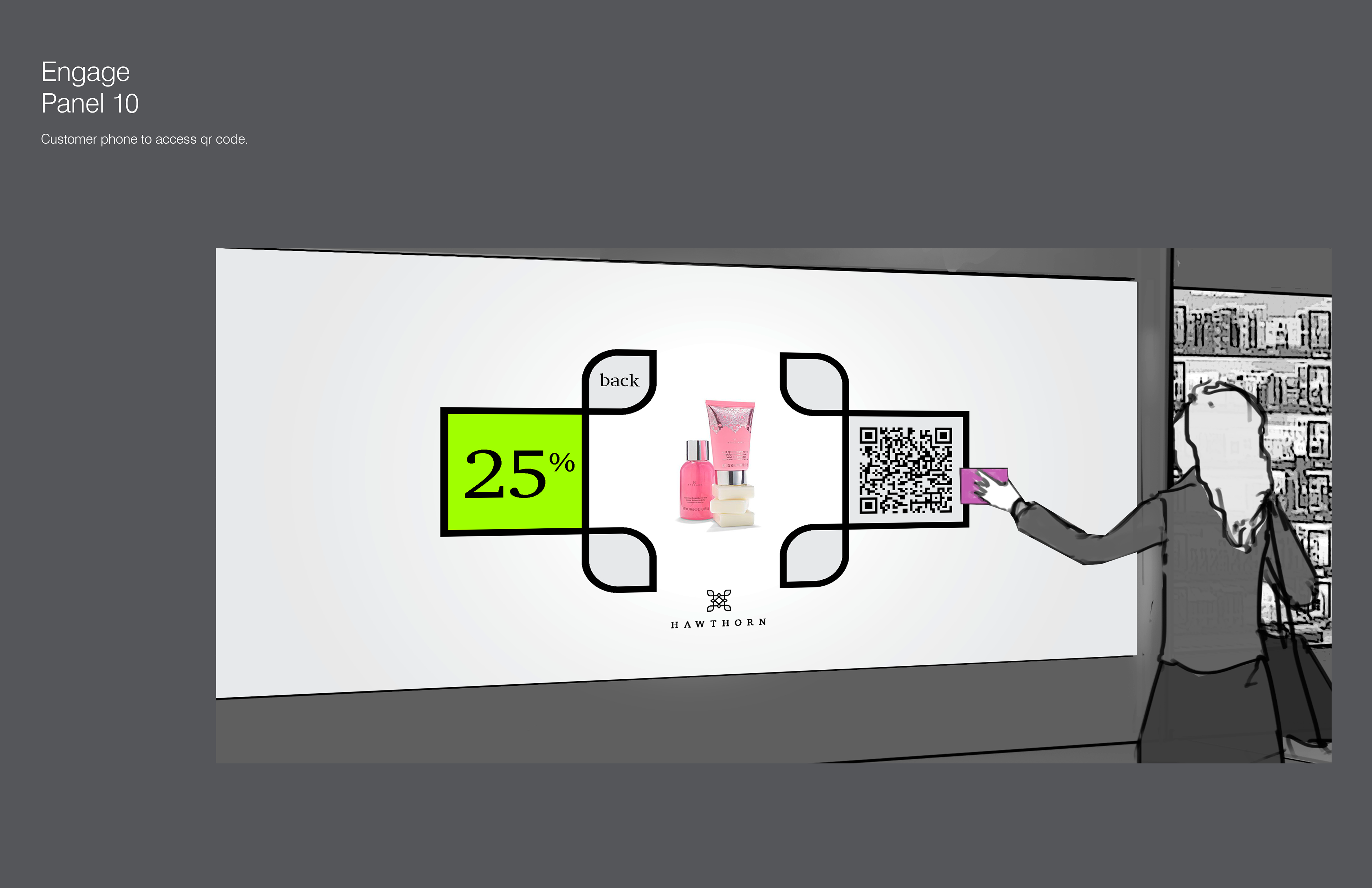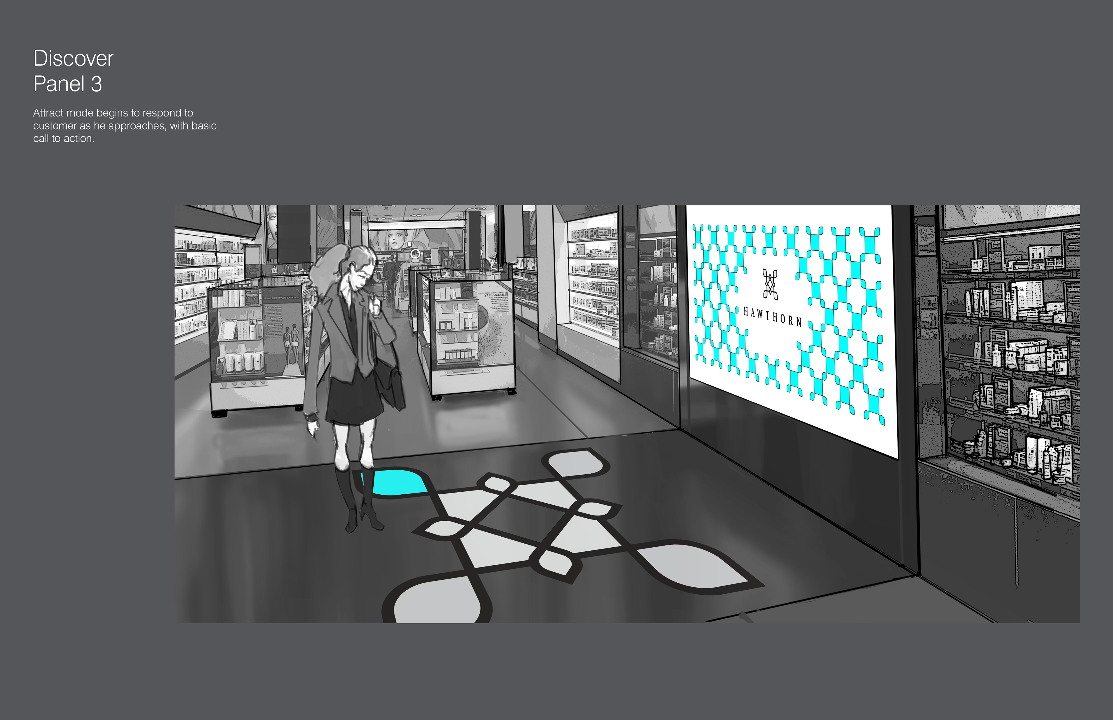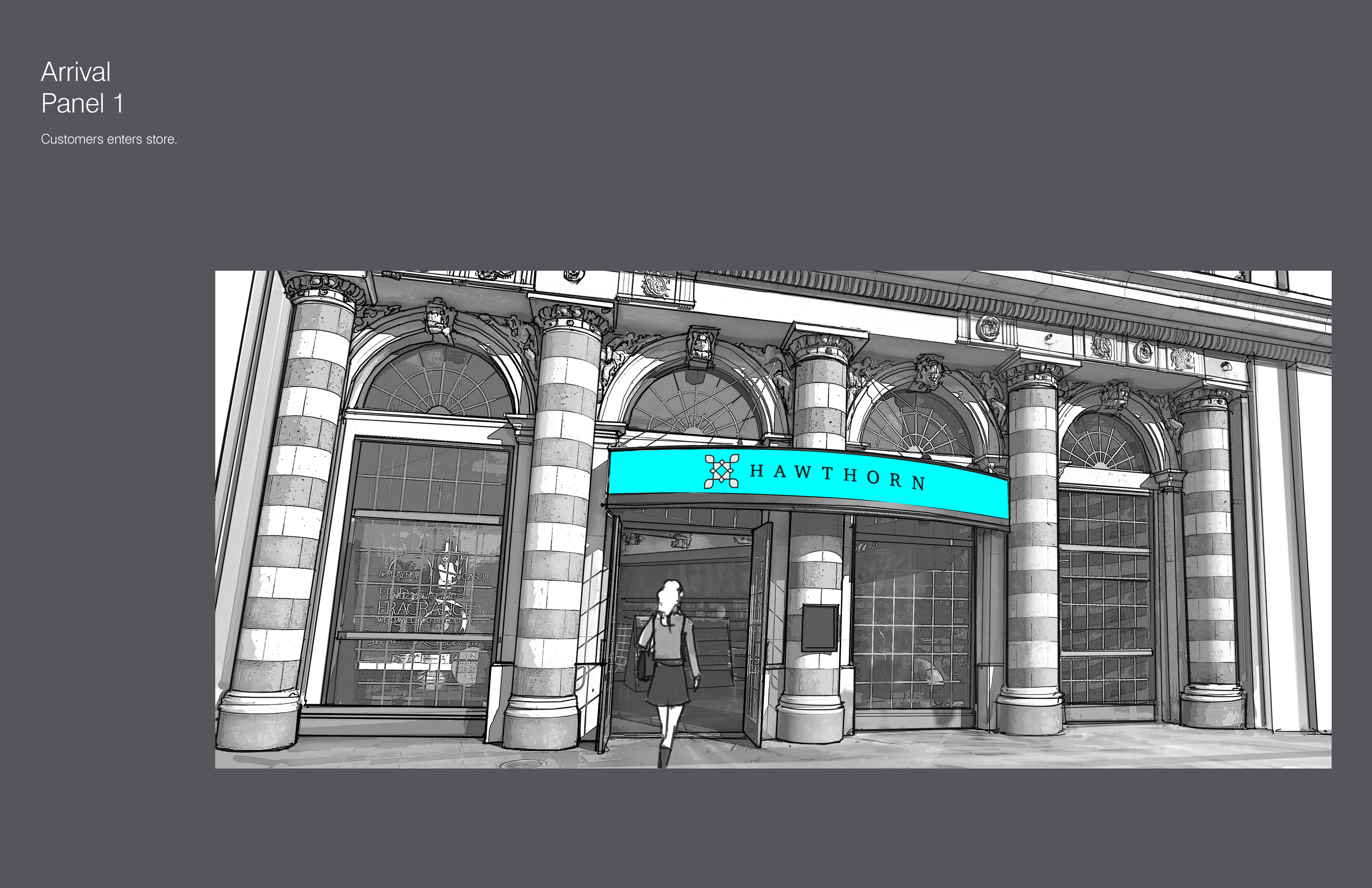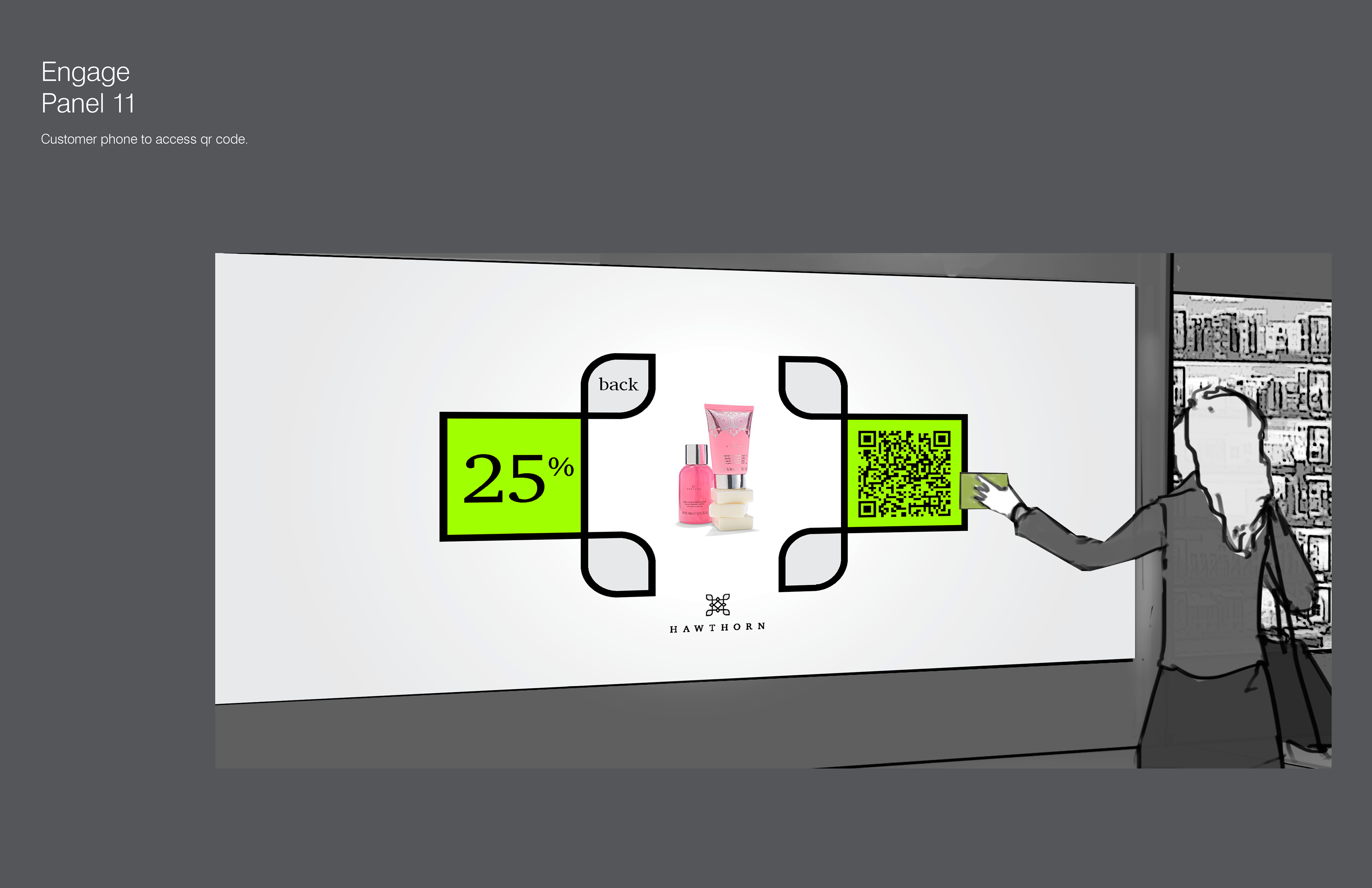 Interactive Retail Experience Created an interactive in-store experience for Hawthorn that guided customers through discovery and engagement. Motion panels responded to movement, displaying personalized content and dynamic offers in real time. The concept combined environmental design, UX thinking, and technology to create a seamless connection between brand, space, and product. Includes: product • branding • digital