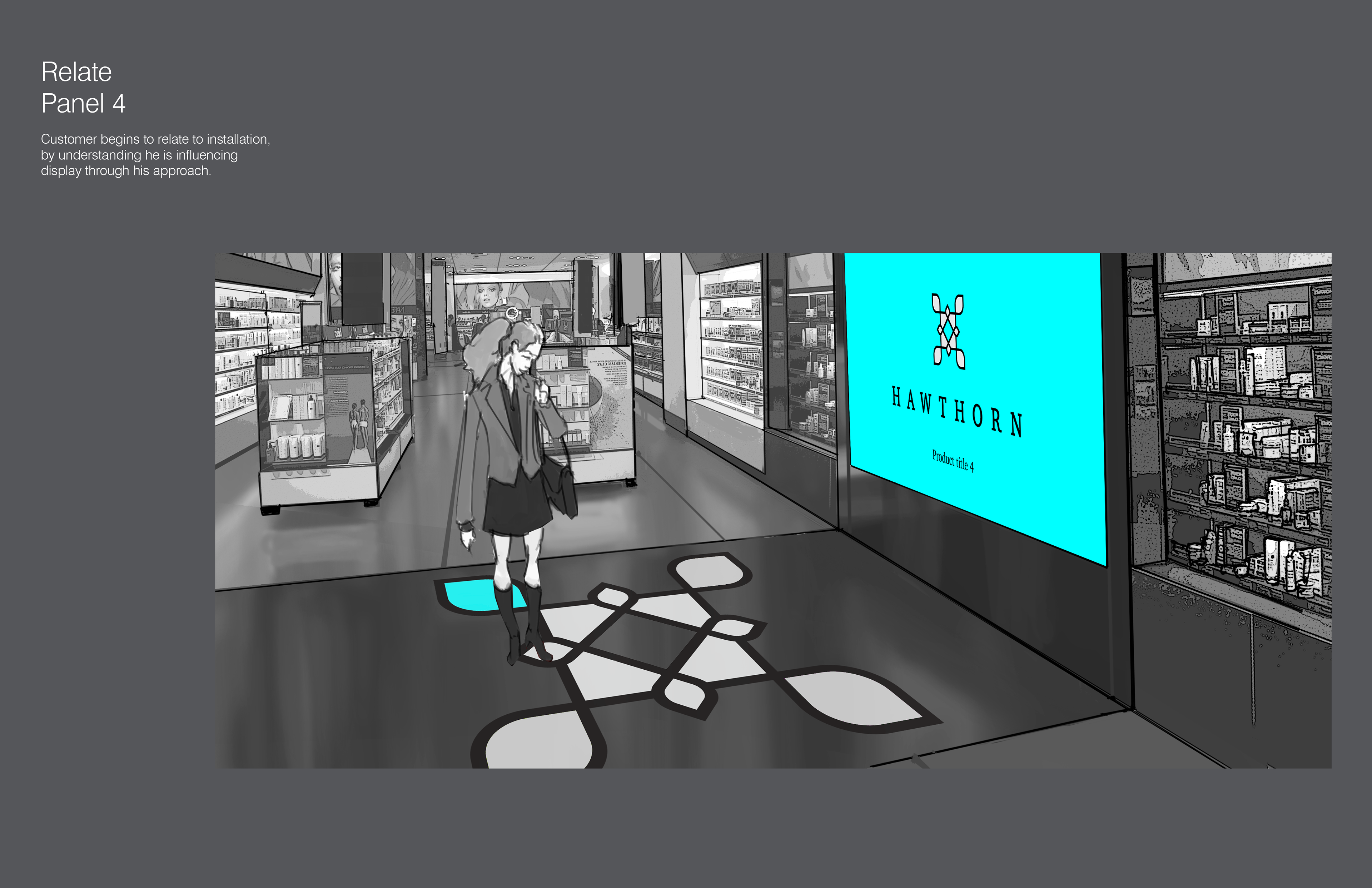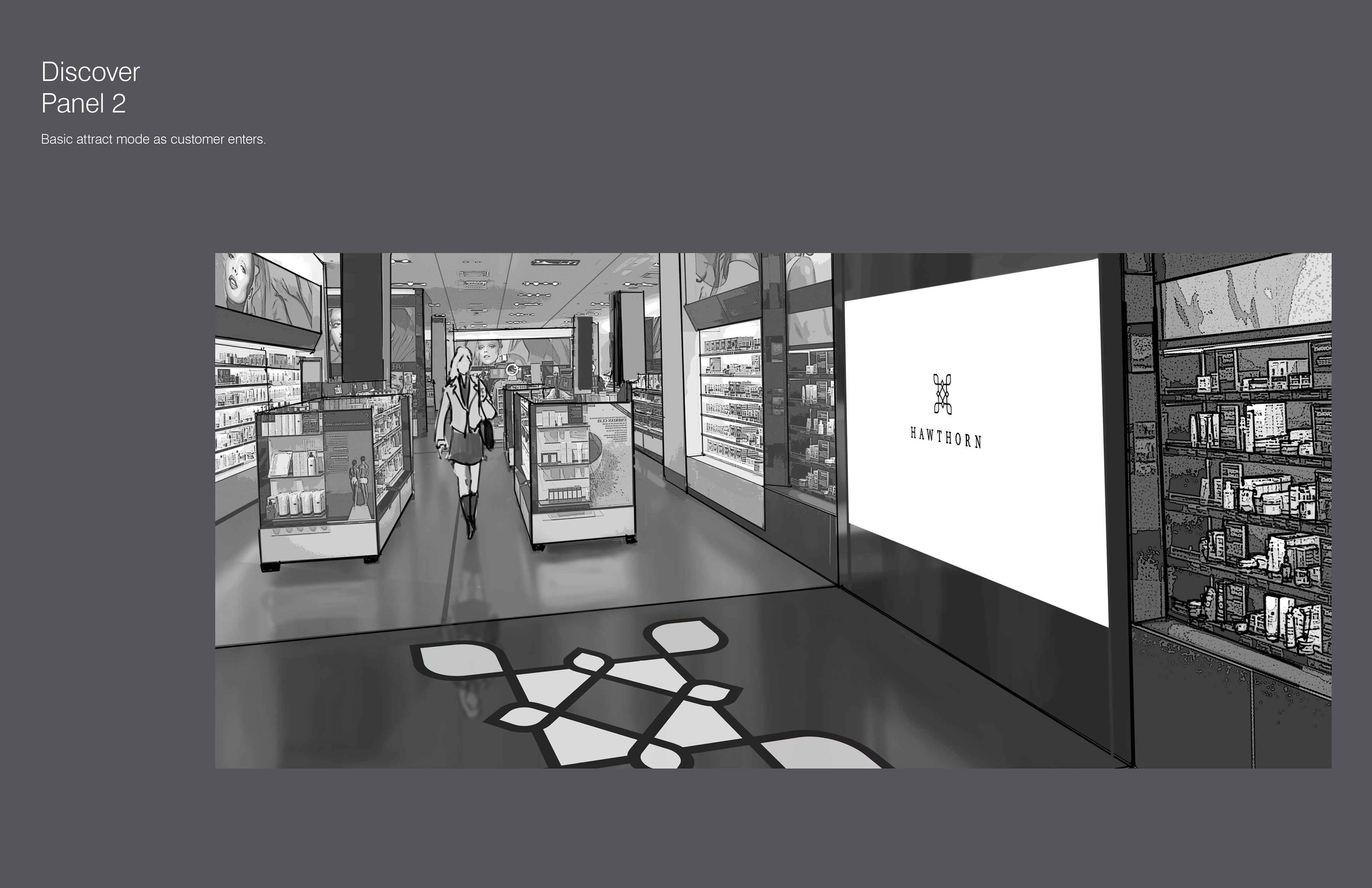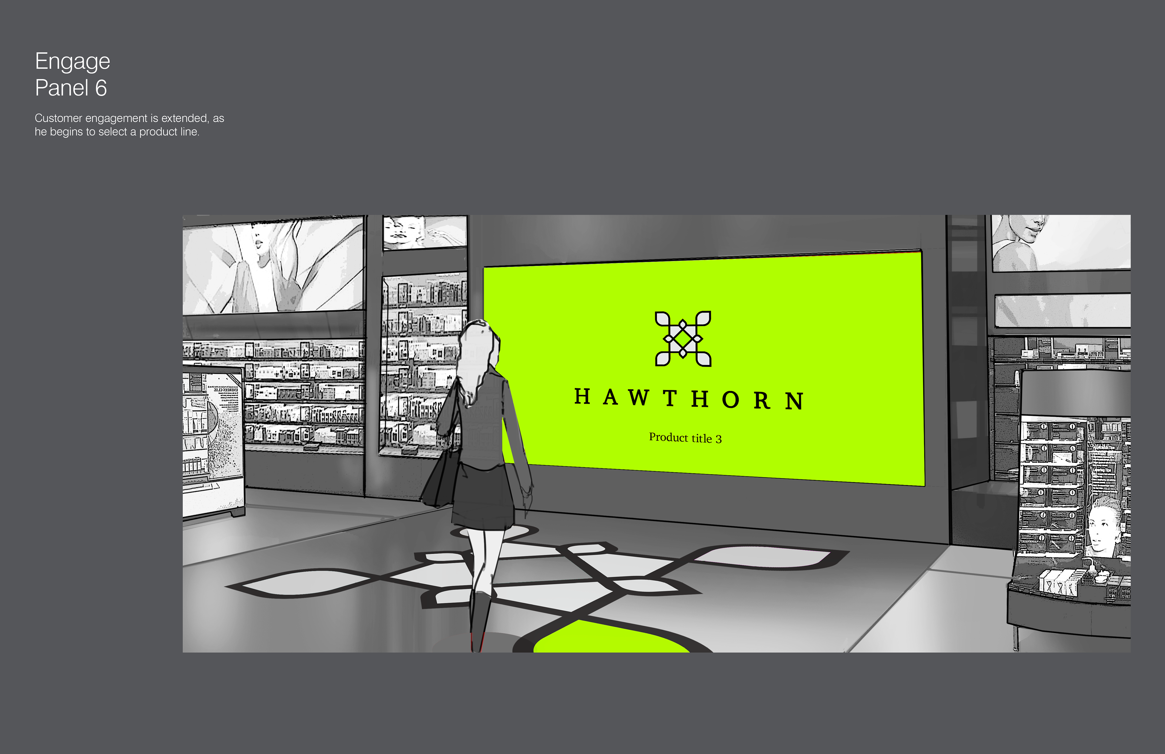 Interactive Retail Experience Created an interactive in-store experience for Hawthorn that guided customers through discovery and engagement. Motion panels responded to movement, displaying personalized content and dynamic offers in real time. The concept combined environmental design, UX thinking, and technology to create a seamless connection between brand, space, and product. Includes: product • branding • digital
