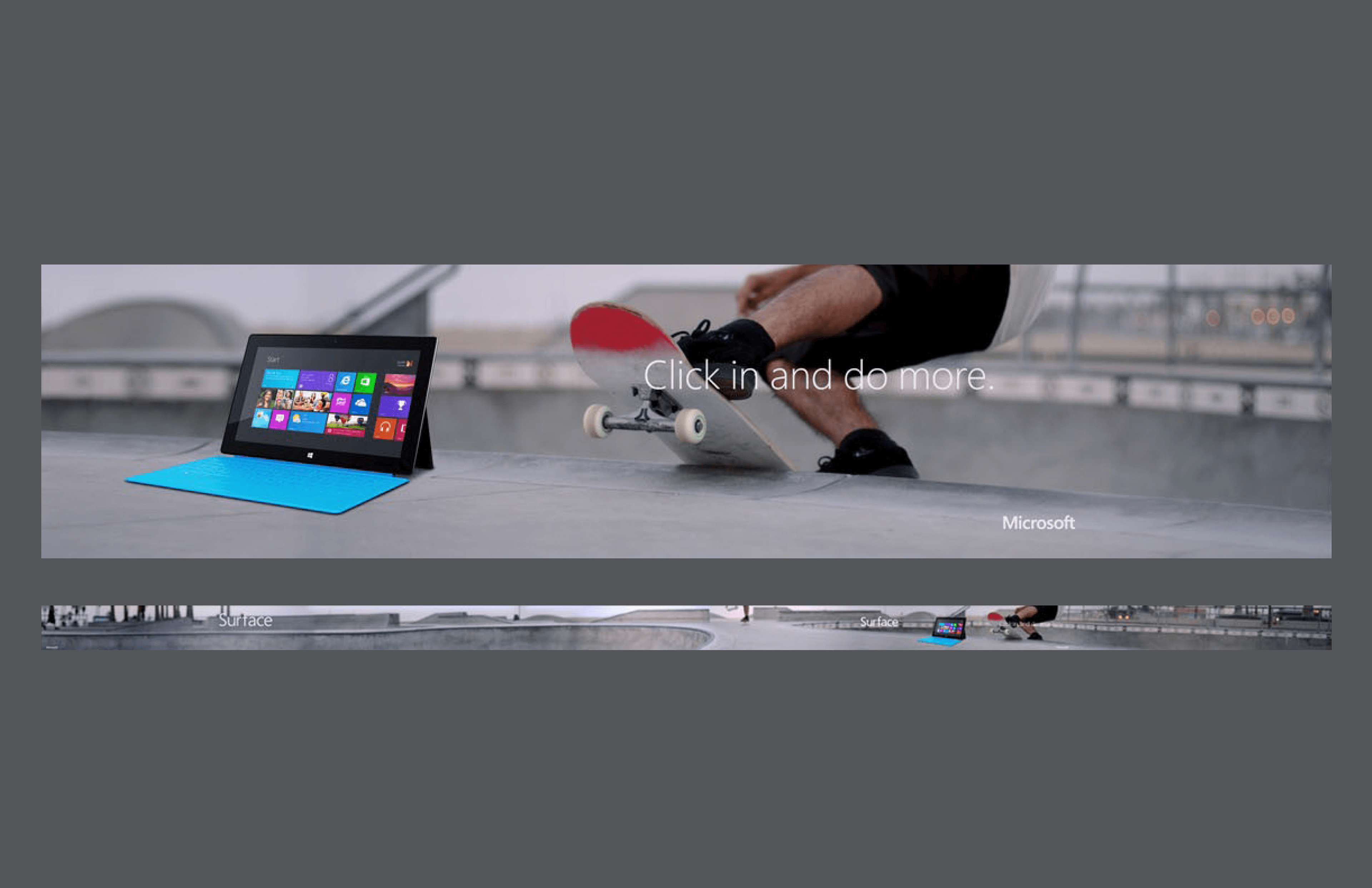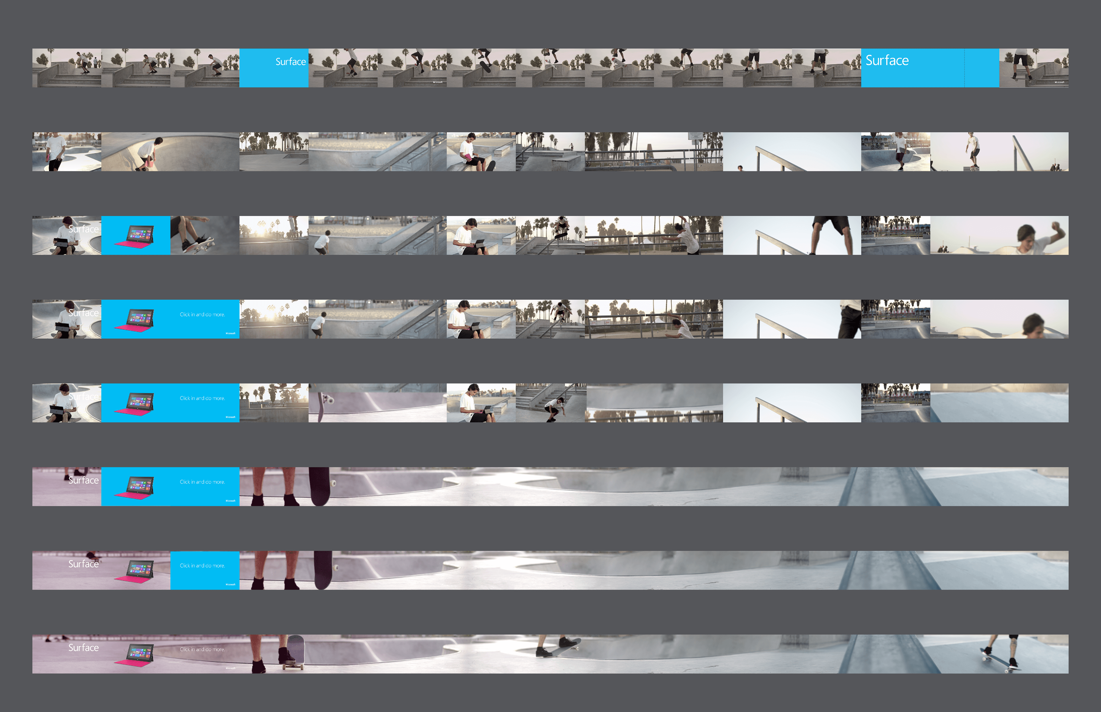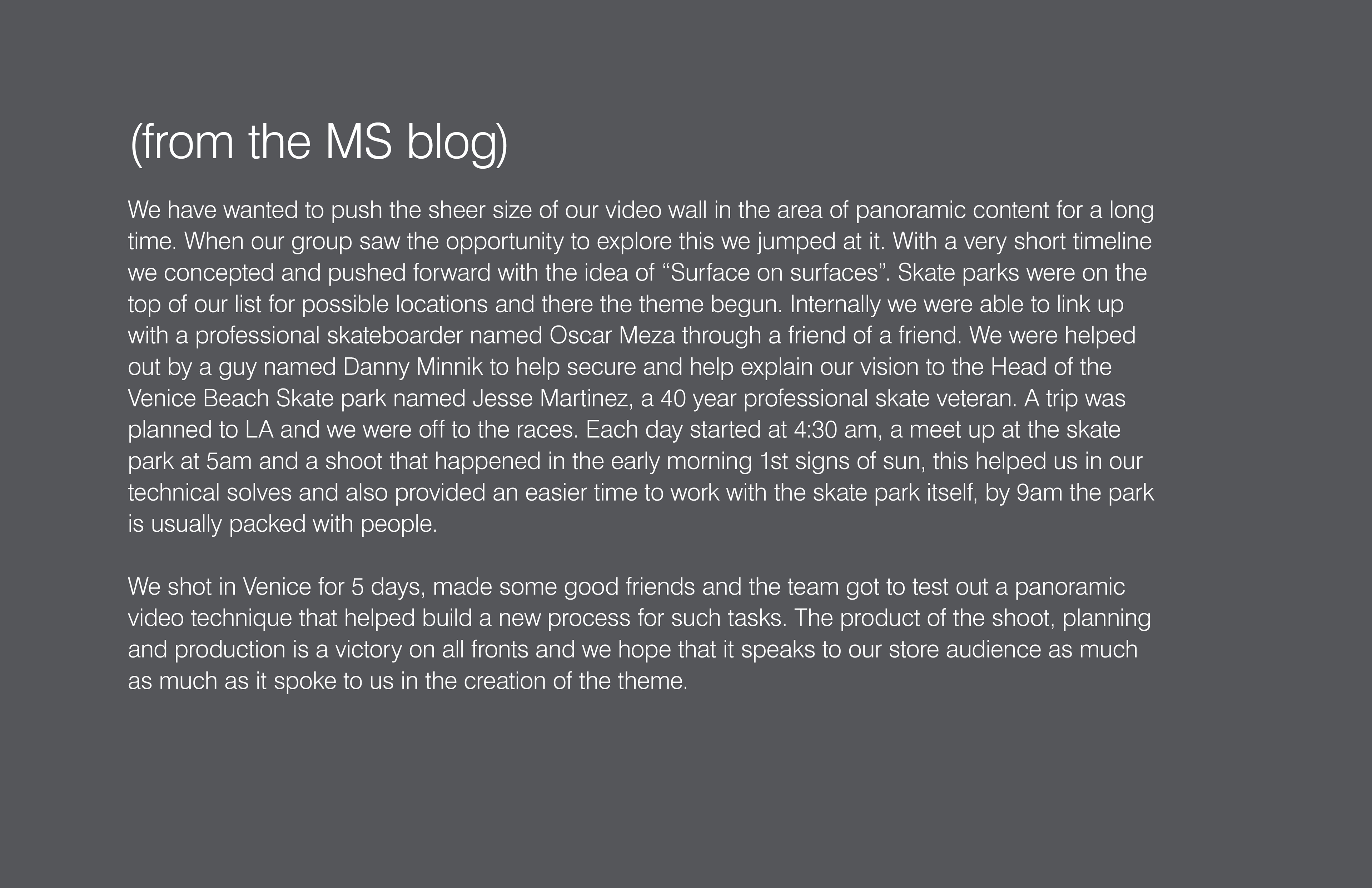 Created a dynamic video wall experience for Microsoft retail stores featuring the Surface tablet in motion. Filmed at Venice Beach Skatepark, the campaign captured authentic skaters interacting with Surface in kinetic, real-life moments. The panoramic visuals showcased product versatility and performance while blending lifestyle energy with Microsoft’s modern design language.