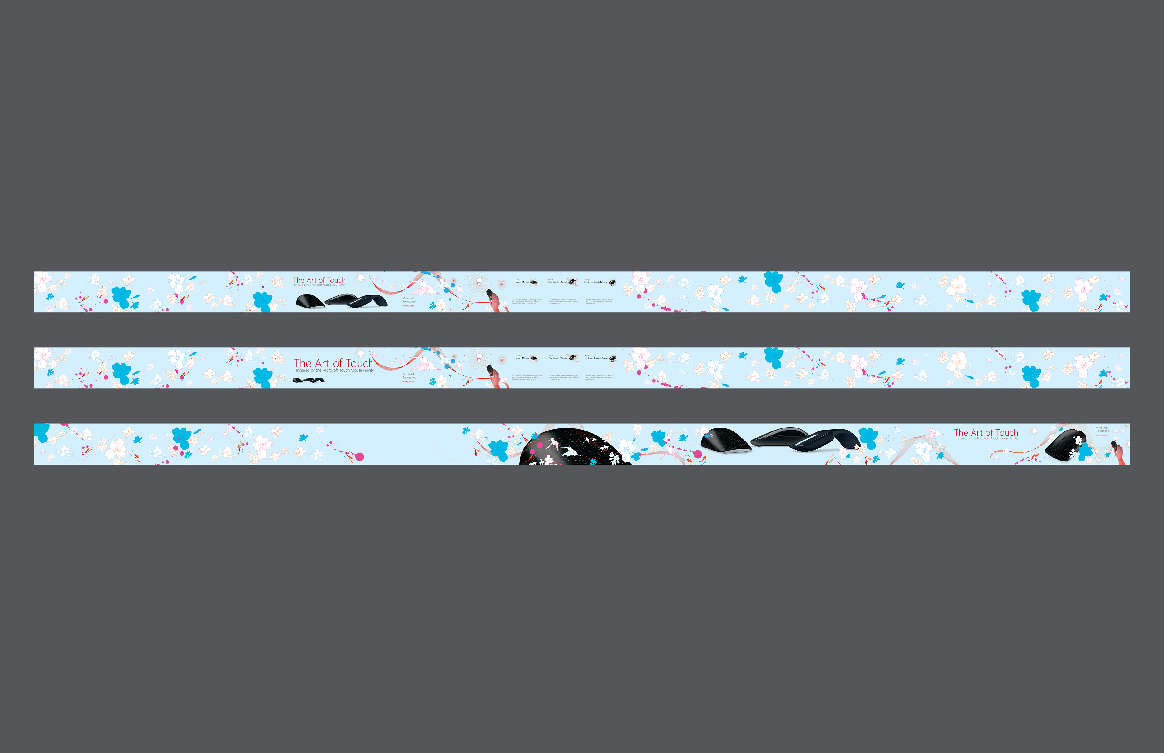 Created a large-scale digital wall experience for Microsoft retail stores to celebrate the launch of the Touch Mouse family. The Art of Touch campaign combined illustration, motion graphics, and technology to express creativity through interactive experiences. The design flowed seamlessly across multiple displays, using movement and pattern to echo the tactile experience of touch.