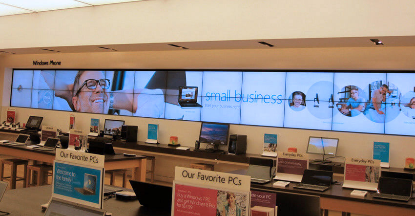 Developed a digital video wall experience for Microsoft retail stores, showcasing Dell small business solutions. Circular motion graphics, bright imagery, and clean typography expressed connection and growth. The modular system highlighted Dell products while reinforcing Microsoft’s brand language across global retail environments.