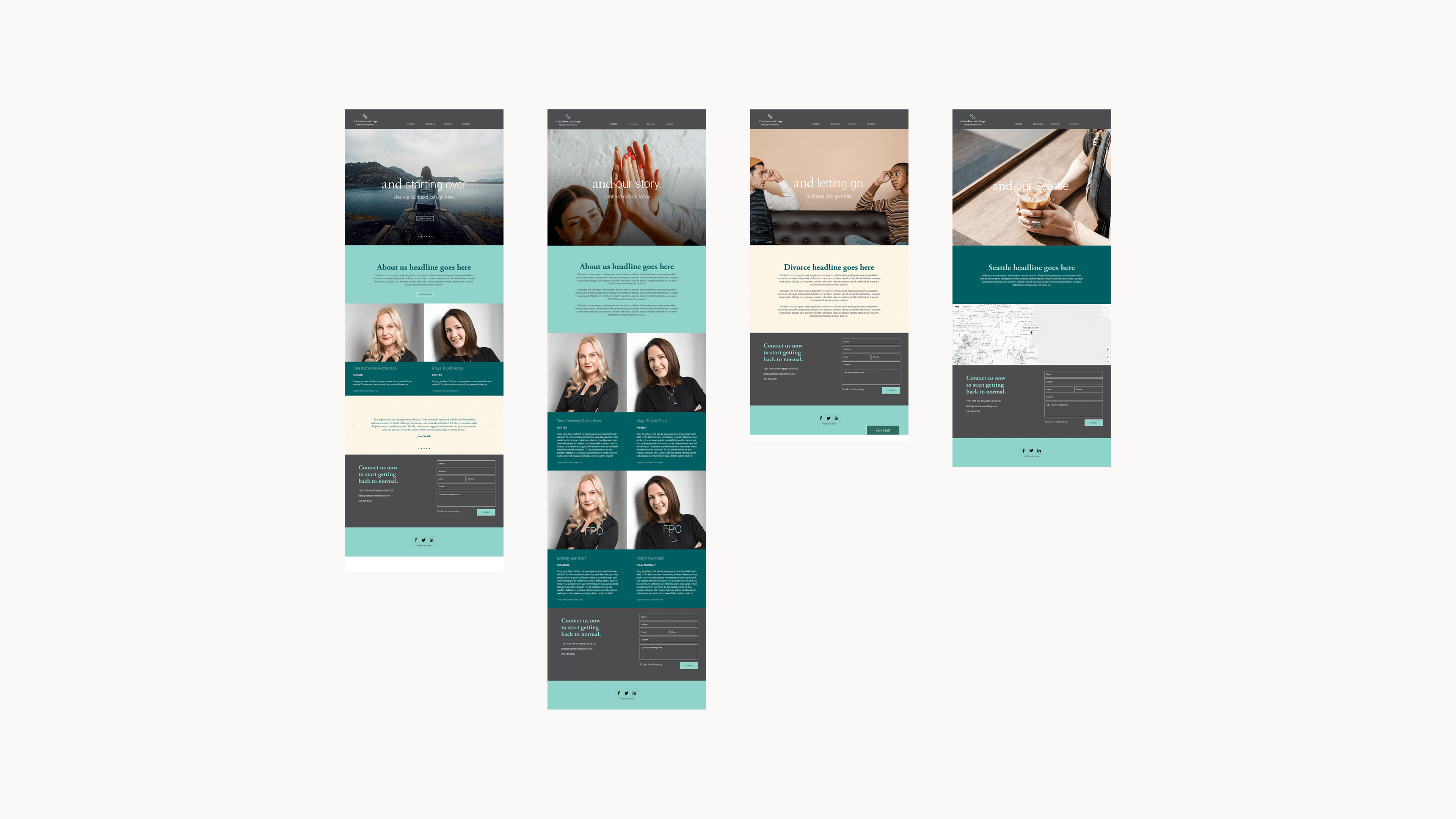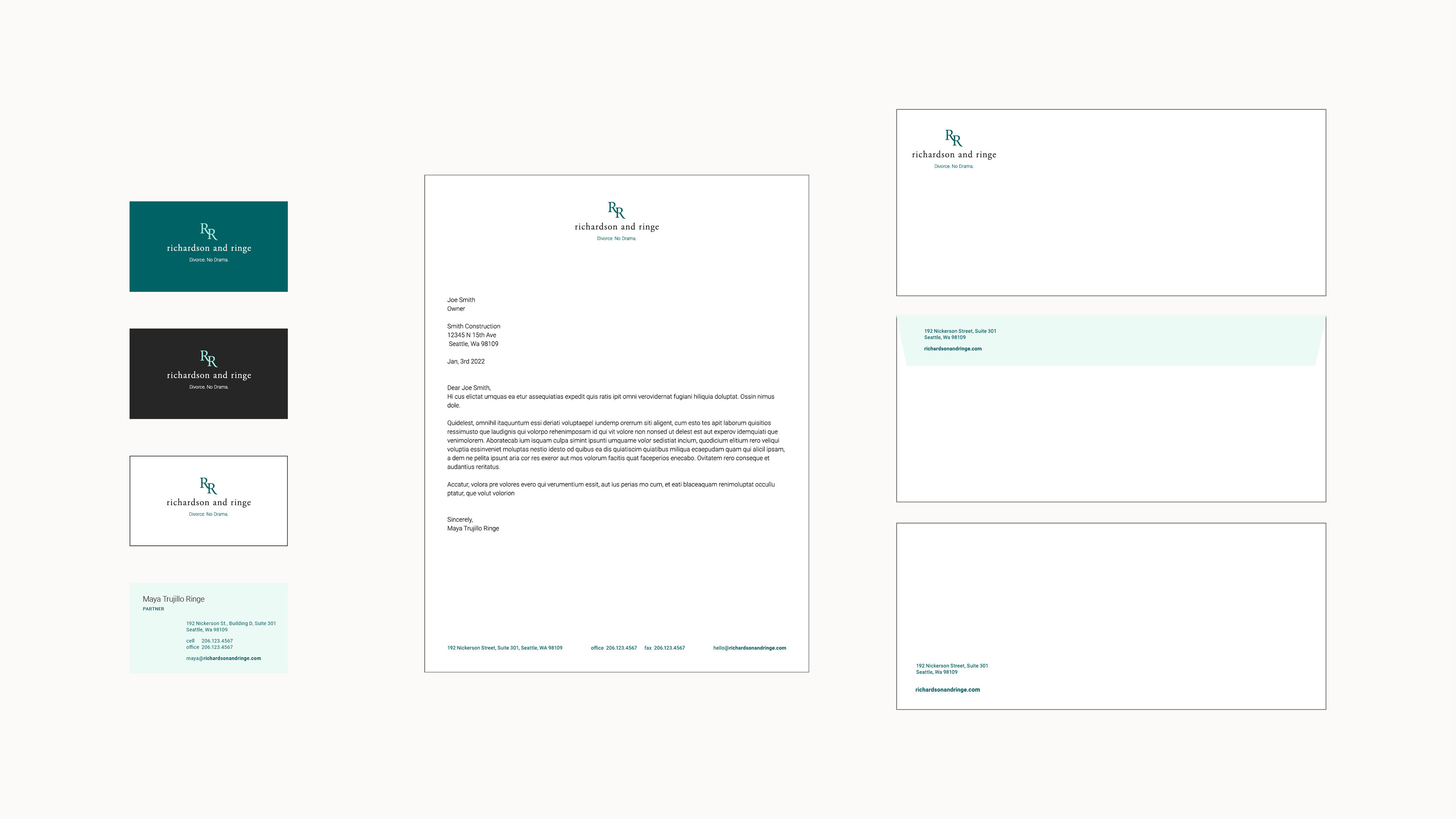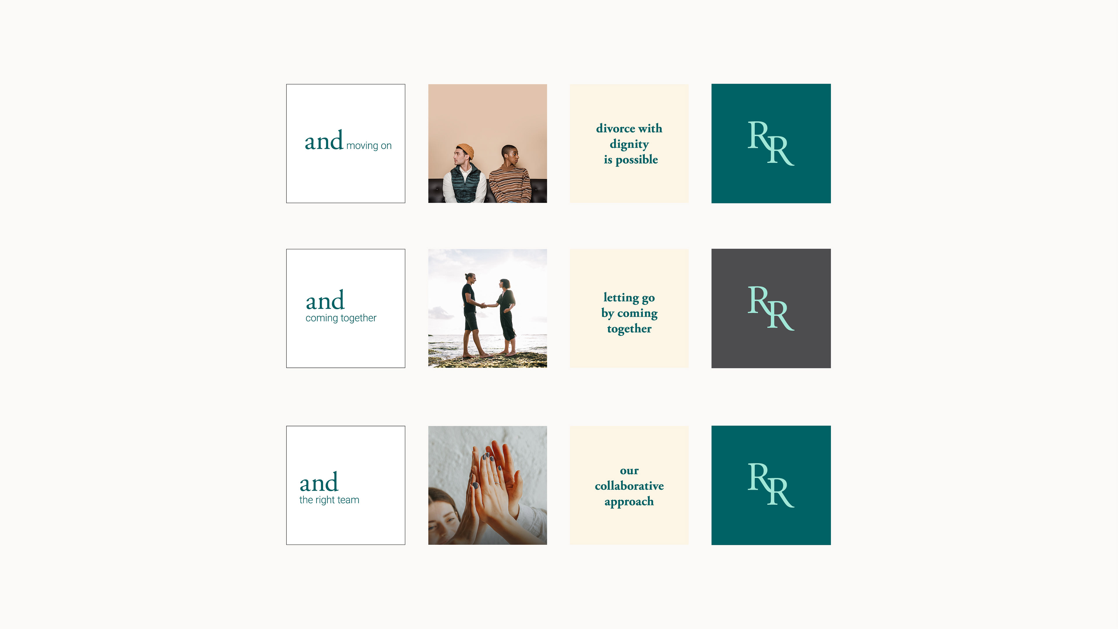 Created a complete brand identity and campaign system for Richardson and Ringe, a law firm specializing in collaborative divorce. Centered on the idea of “and…”, the messaging employs empathetic phrases like “and moving on” and “and starting over” to convey renewal and hope. Calm typography and a soft color palette reflect dignity, clarity, and trust.