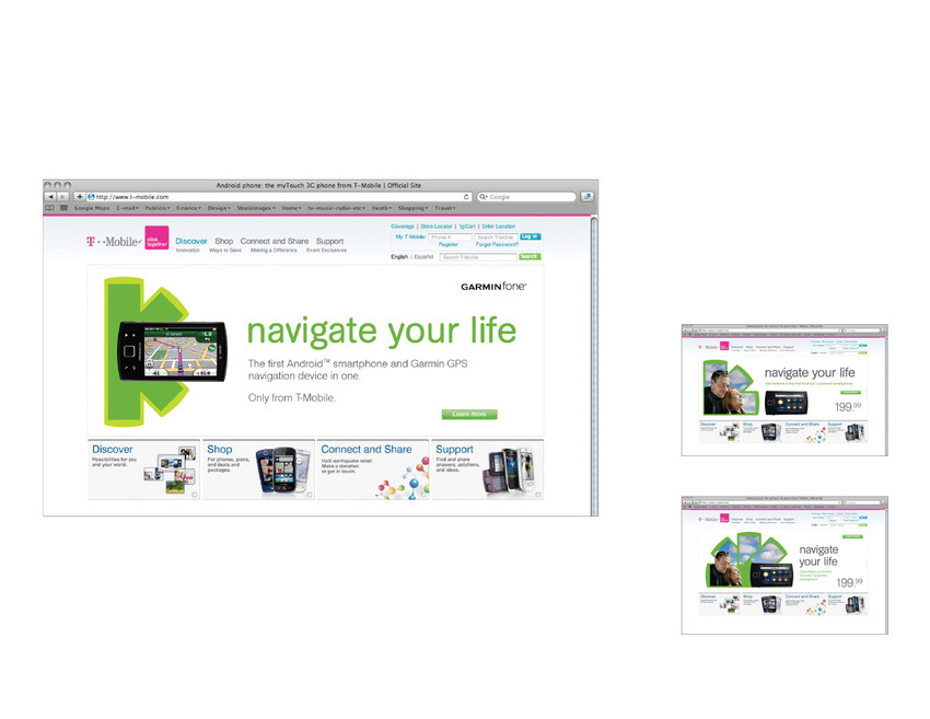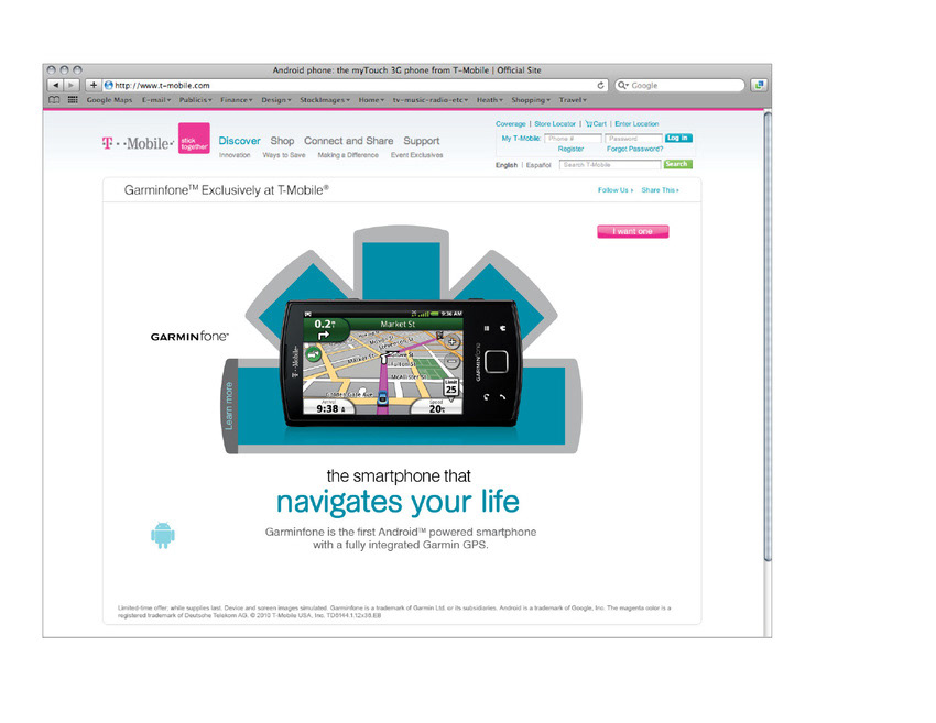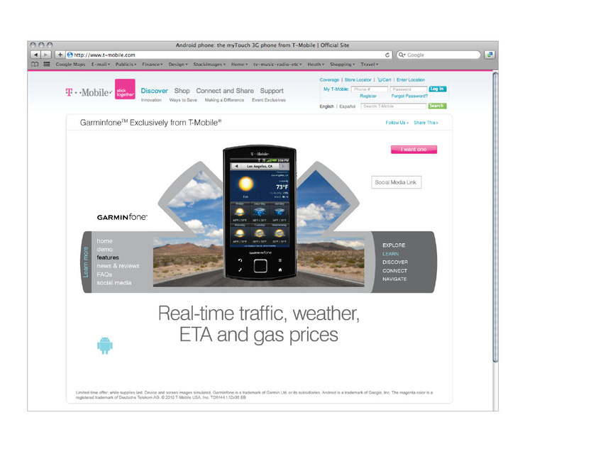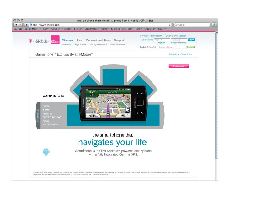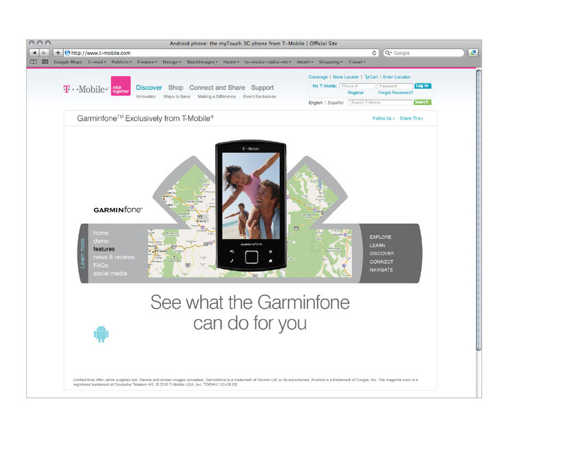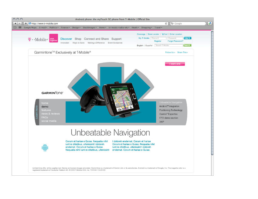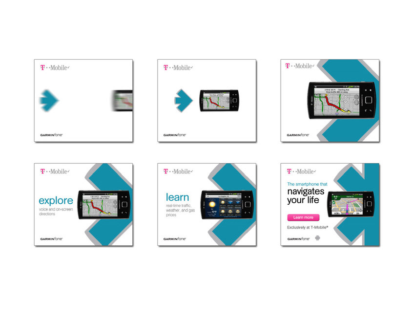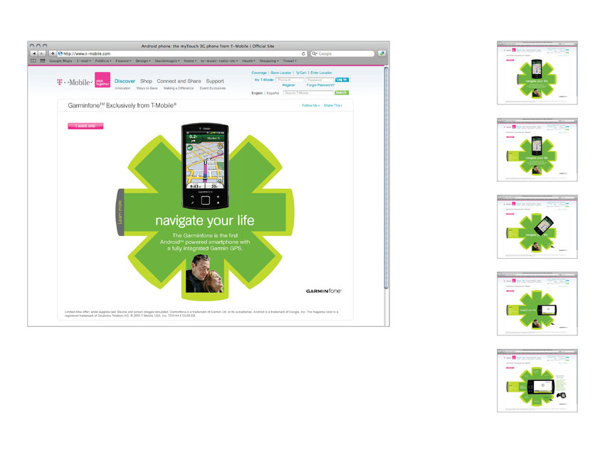 Garminfone Website and Launch Campaign Designed the digital launch experience for T-Mobile’s Garminfone, the first Android-powered smartphone with built-in GPS navigation. The campaign emphasized clarity and direction through subtle motion and simple navigation cues. Color, photography, and layout reflected ease of use and the brand’s modern, connected identity. Includes: campaign • digital